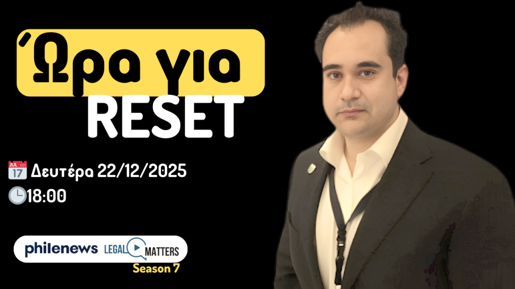 Καθώς ολοκληρώνεται το 2025, στο τελευταίο επεισόδιο της χρονιάς το LegalMatters αλλάζει ταχύτητα και ασχολείται με ένα θέμα διαφορετικό από τα συνηθισμένα. Με τίτλο «Ώρα για Reset» και με την συνδρομή του Δρ. Χάρη Τύμβιου, συζητάμε για τον εαυτό μας και το πώς τον φροντίζουμε σε μία εποχή που ο τρόπος και οι ρυθμοί ζωής […]